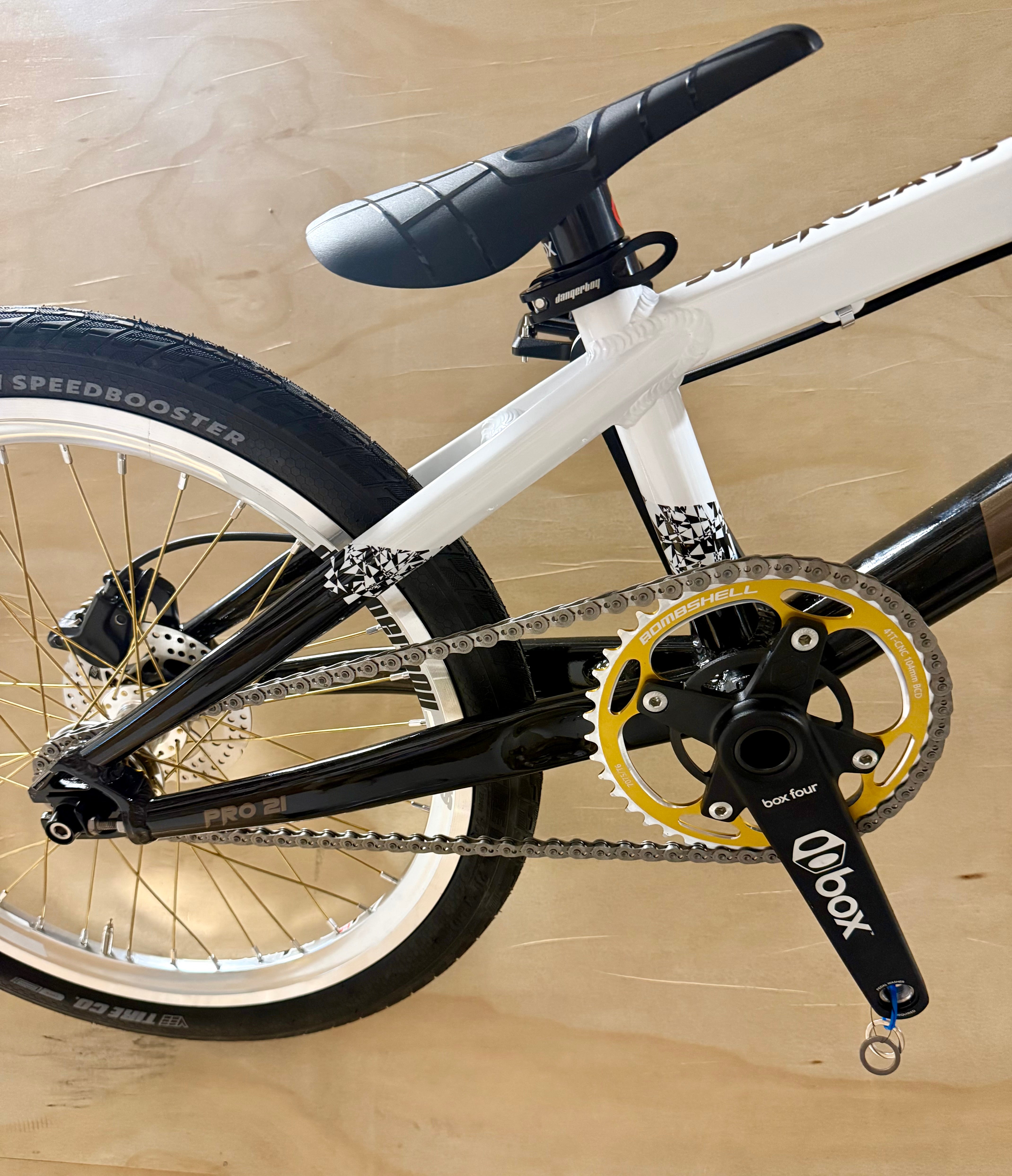 Paired with Vee Speedbooster tires, Dangerboy hubs, this custom Pearl White and Black build blends elite-level performance with clean, race-proven style.